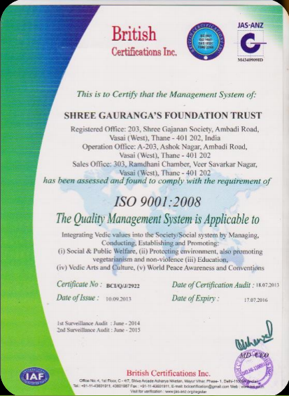 Shree Gauranga’s Foundation Trust is Awarded ISO9001:2008 Certification for its sincere effort and tring to improve on its processes on regular baisis, through continual improvement of the Quality Managment Systems.